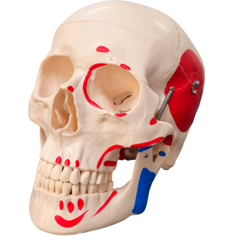 Modelo anatômico em tamanho real desenvolvido para o estudo detalhado da anatomia craniana e da inserção muscular. Representa com fidelidade as estruturas ósseas e os pontos de origem e inserção dos músculos, sendo ideal para o ensino e demonstração em áreas da saúde.