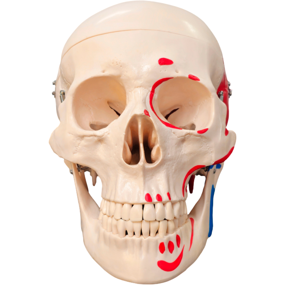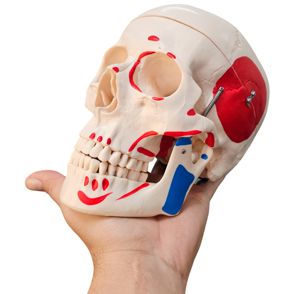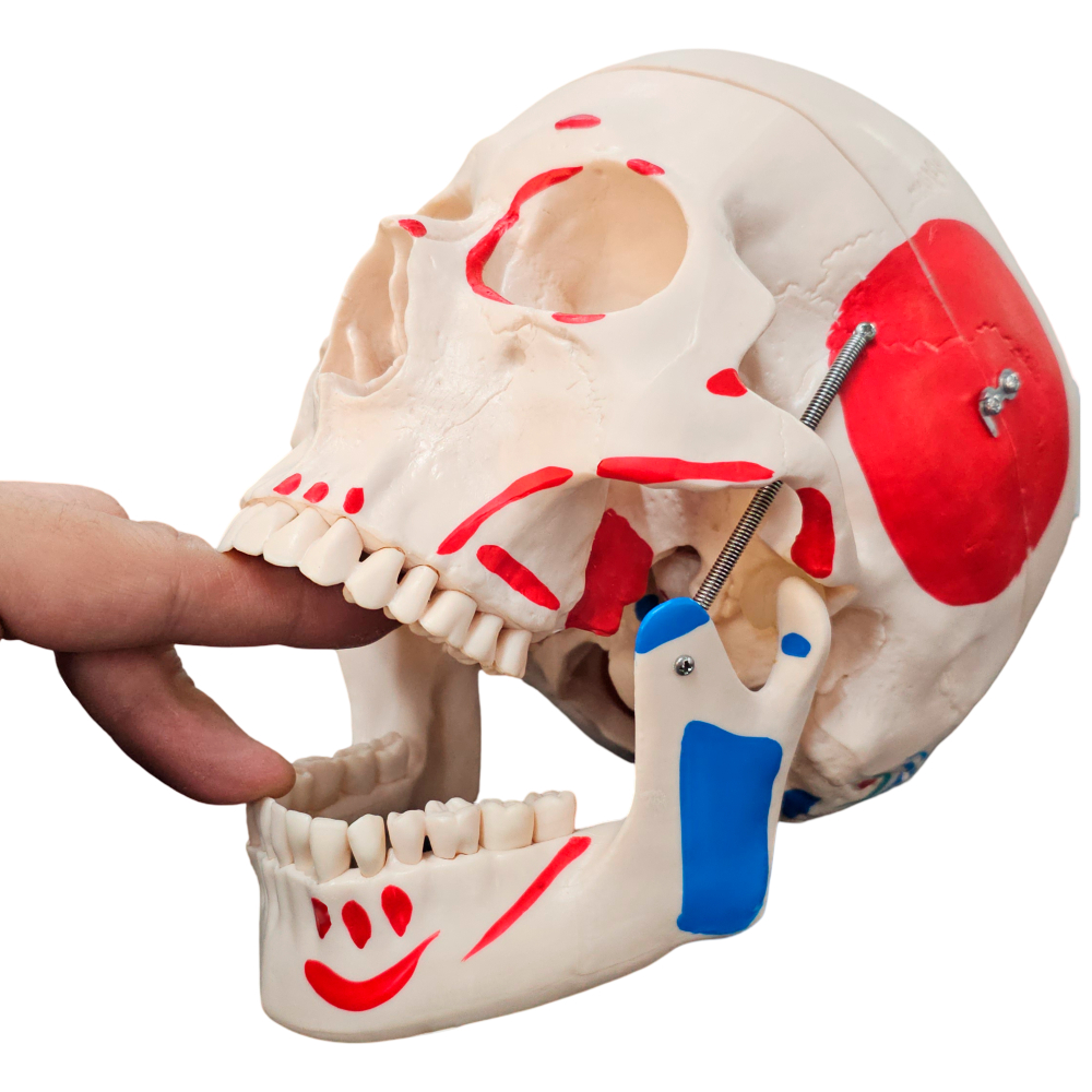 Fabricado em PVC de alta durabilidade, o modelo apresenta mandíbula móvel, calvária removível e linhas de sutura evidentes, proporcionando uma visualização precisa das estruturas anatômicas. O lado esquerdo do crânio é pintado com cores distintas — vermelho para pontos de origem e azul para pontos de inserção — facilitando o aprendizado e a identificação das regiões musculares. A pintura é resistente e cuidadosamente aplicada para manter o realismo e a durabilidade do material.